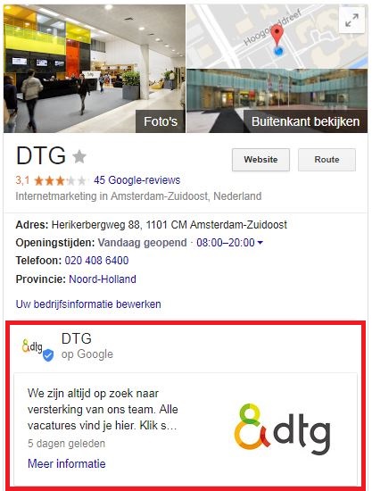 Sinds eind juni kun je gratis berichten plaatsen in de Google-zoekresultaten. Deze worden getoond bij je bedrijfsinformatie in het Knowledge Panel: de informatie die je bij een desktop-zoekopdracht rechts in beeld ziet verschijnen. Hieronder zie je een voorbeeld van VRHL die deze gratis extra ruimte gebruikt om de vacaturepagina onder de aandacht te brengen.