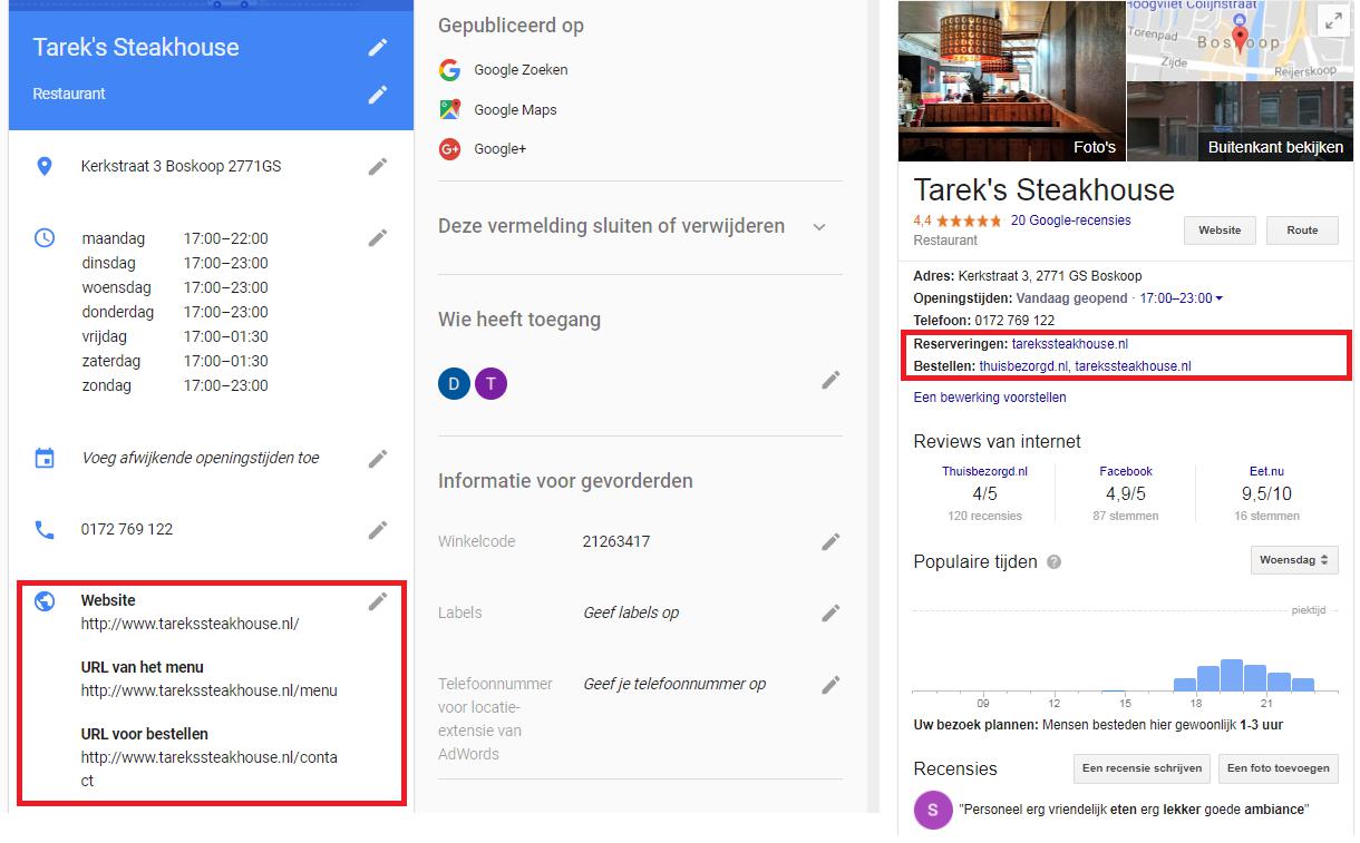Links in het Google Mijn Bedrijf-dashboard kun je URL’s met verschillende doeleinden toevoegen en rechts zie je onder het telefoonnummer dat er extra URL’s in het Knowledge Panel staan in de Google zoekresultaten. Tarek’s Steakehouse maakt handig gebruik van deze extra velden om klanten direct op de goede pagina te laten landen.