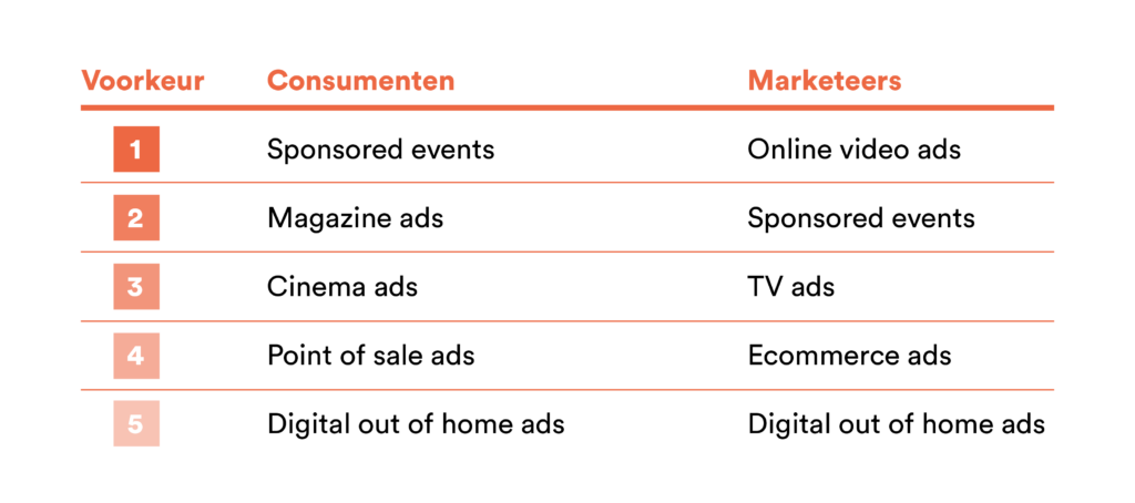 Daar gaan marketeers weleens de mist mee in; zij hebben de neiging te kiezen voor online video ads, sponsored events en tv-advertenties. Dat zijn ook aantrekkelijke media, gezien de mogelijkheden die zij bieden om resultaten meetbaar te maken. Alleen geven consumenten de voorkeur aan reclame in de vorm van sponsored events (daar doen marketeers het dus goed), magazineadvertenties en reclame in de bioscoop. Een goed verkoopargument voor uitgeverijen van tijdschriften, en een punt om rekening te mee te houden in de middelenmix voor marketeers. En voor wie meetbaarheid belangrijk vindt, is een bezoekers-, lezers- of merkonderzoek een goede optie. Of – in magazines – het gebruik van QR-codes (met UTM-code!), waar het vervolg van een artikel kan worden gelezen, een ander verdiepend artikel kan worden geraadpleegd of een product kan worden besteld.