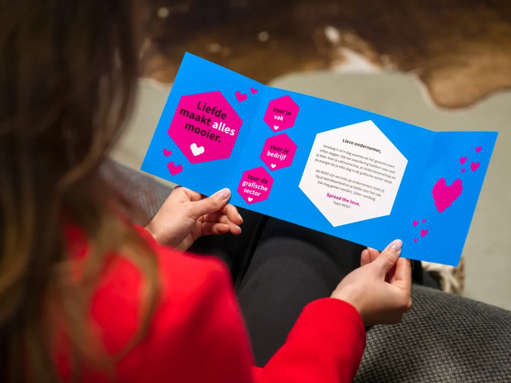 Voor KVGO, de branchevereniging van grafische ondernemers, ontwikkelden we een Valentijnsactie met een duidelijke missie: leden enthousiasmeren om andere grafische ondernemers lid te maken van het KVGO. Het concept is simpel en krachtig: ‘Spread the love’.