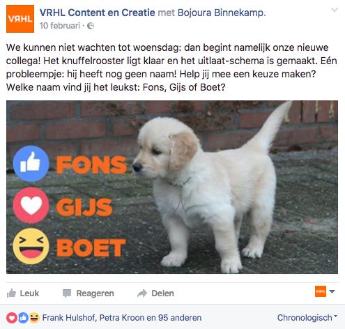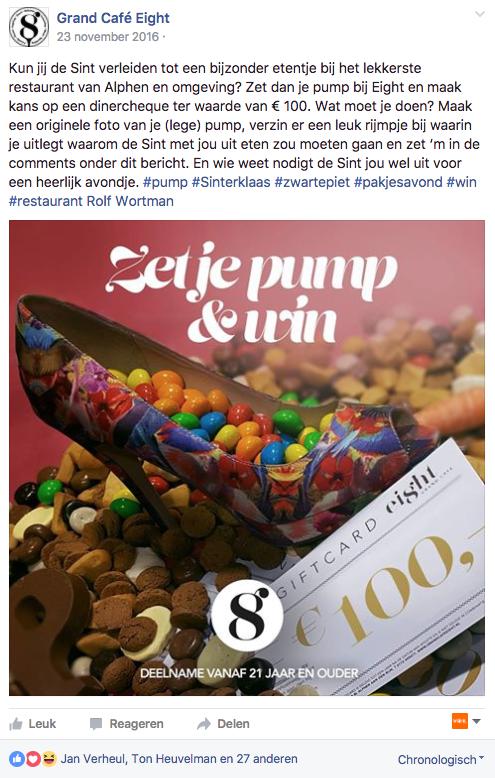 Bedenk leuke acties waarmee je interactie met je pagina of bericht creëert. Pas wel op, want Facebook heeft hier regels aan verbonden. Platte like&share-winacties zijn niet toegestaan, omdat ze spam veroorzaken. Wees wat creatiever en laat volgers reageren op je bericht met een foto of leuke inzending.