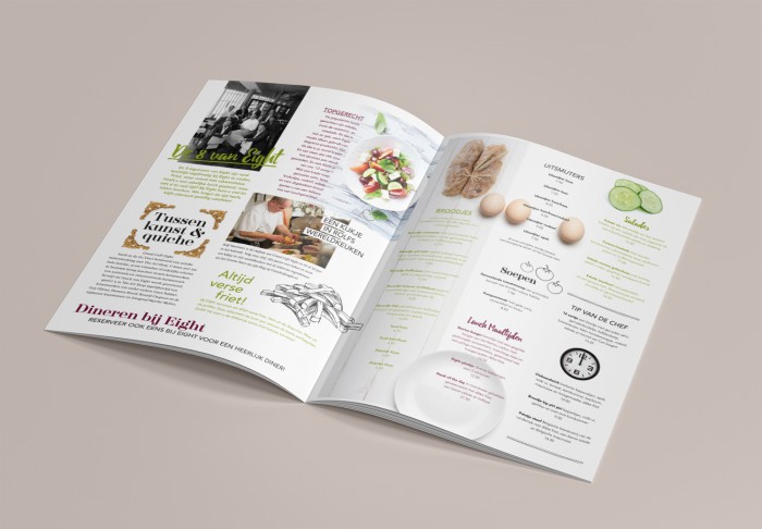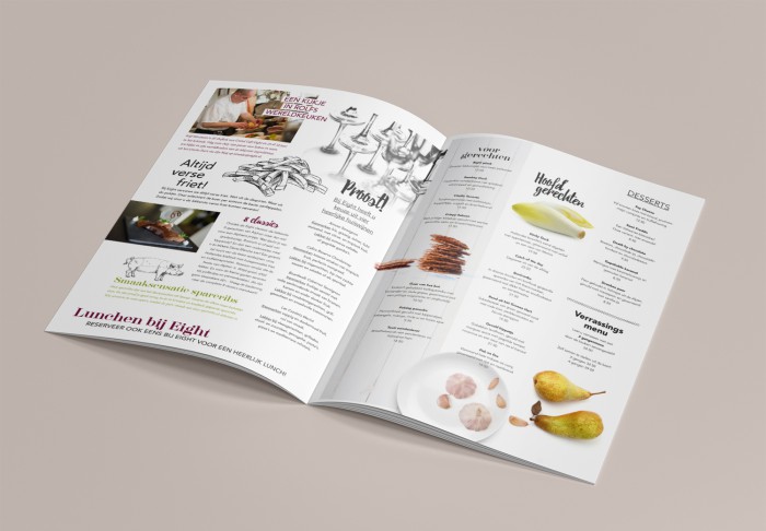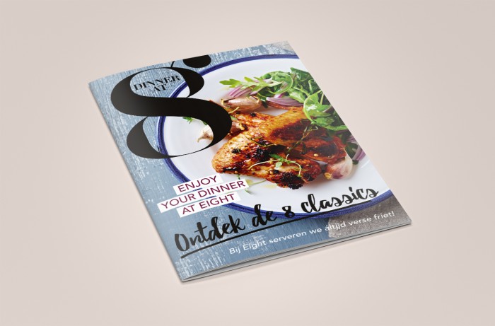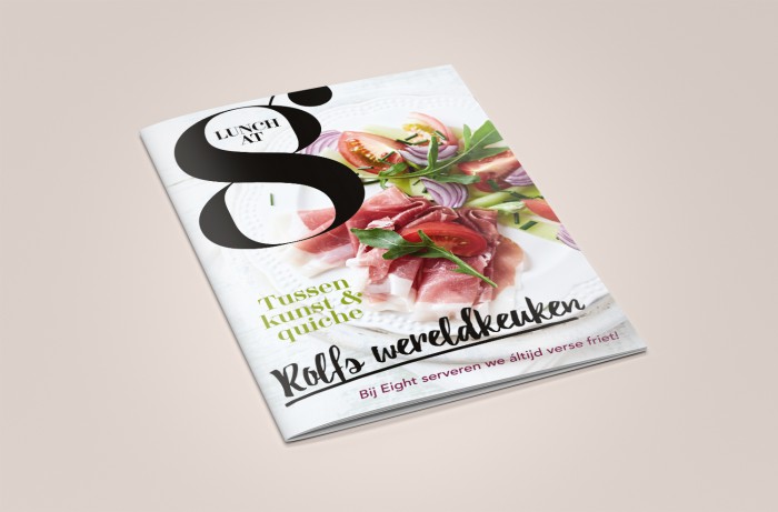 Wij verzorgden de redactie en vormgeving van Eights nieuwe lunchkaart en dinerkaart. Hierin vind je verrassende nieuwe gerechten én alles wat je nog meer over Eight wil weten. Bijvoorbeeld dat Eight áltijd verse friet serveert, de spareribs van het ibericovarken (dat zijn hele leven alleen maar kastanjes heeft gegeten) uit Spanje komen en over Eights unieke samenwerking met The Art Shop.