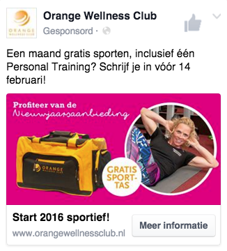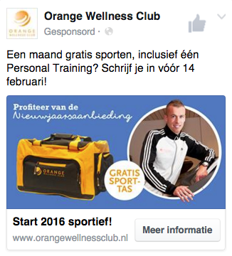 Facebook telt meer dan 800 miljoen gebruikers die dagelijks inloggen. Daarom is het een effectief marketingmiddel voor bedrijven zoals Orange. Adverteren op Facebook is vanwege de combinatie tussen het aantal gebruikers en de specifieke segmentatiemethoden heel interessant: je bereikt je doelgroep en verhoogt je naamsbekendheid, betrokkenheid en conversie. Voor Orange hebben we onderstaande twee advertenties ingezet. Deze werden getoond aan personen tussen de 25 en 55 jaar, wonend in Alphen aan den Rijn met de interesses sauna, fitness en sporten. Hiermee bereikten we ruim 13.000 personen.