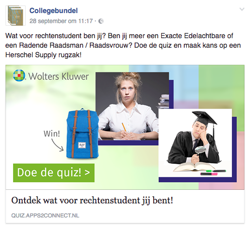 Dit jaar zijn voor het eerst activaties op Facebook ingezet: studenten doen een korte quiz, voeren een aantal gegevens in (zoals naam, mailadres en studiejaar) en maken kans op bijvoorbeeld een mini-Collegebundel (met post-its) of een Herschel Supply rugzak. Met deze online activaties verzamelt Wolters Kluwer persoonlijke gegevens over (potentiële) rechtenstudenten en kan hen op die manier gedurende hun gehele rechtenstudie en carrière daarna blijven voorzien van relevante (social media) content.