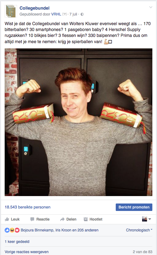 Social media speelt altijd een belangrijke rol gedurende de promotiecampagne. Op Facebook hebben we de afgelopen jaren een behoorlijke fanbase en daarmee een flink bereik opgebouwd. Ook Instagram speelt een belangrijke rol. De Collegebundel is onder rechtenstudenten erg geliefd. Uit de reacties op social media blijkt dat studenten echt een band hebben met hun Collegebundel. Gedurende de zomer maakten wij relevante en interessante content (zowel copy als visuals) voor Facebook en Instagram.