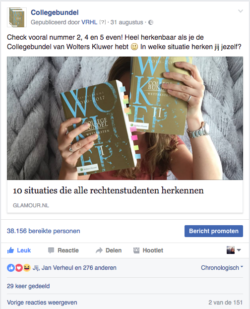 Iedere rechtenstudent kent de Collegebundel van Wolters Kluwer: de meest geliefde én meest gebruikte wettenbundel. Onmisbaar tijdens de studie! Jaarlijks komt er een nieuwe versie op de markt. Om de wettenbundel goed onder de aandacht te brengen bij (aankomende) rechtenstudenten, voeren wij al een aantal jaar fanatiek campagne. Ook dit jaar was dit weer een waar (contentmarketing)feestje!