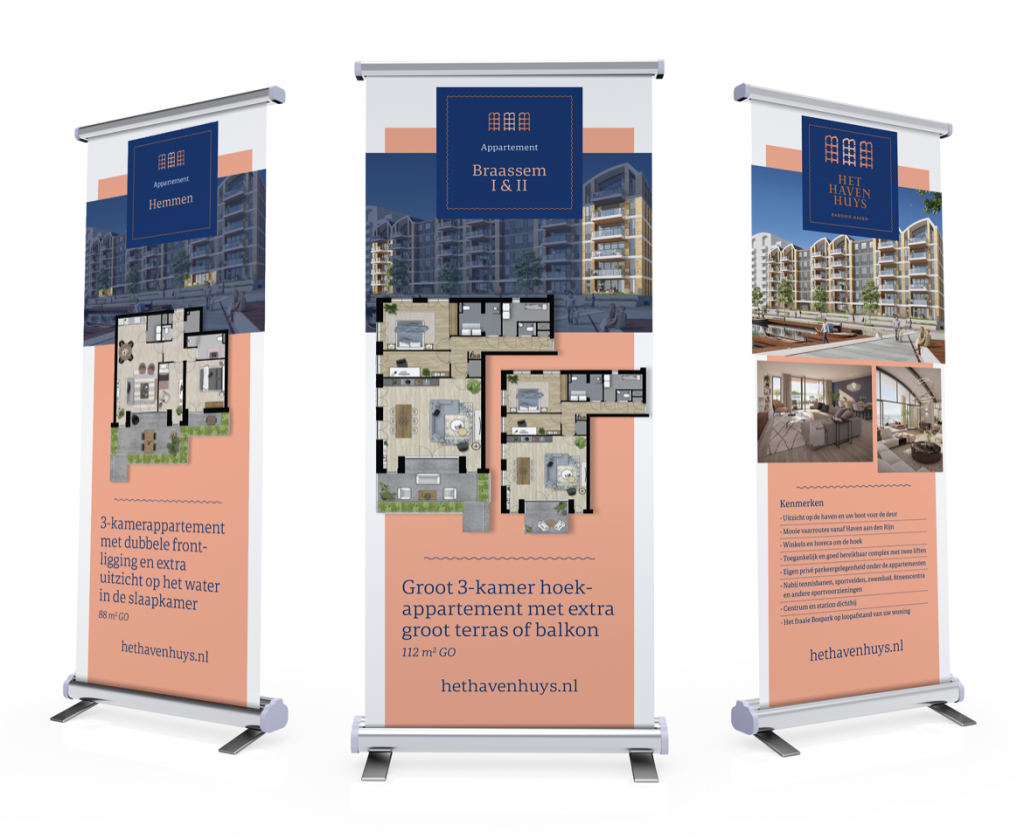 Allereerst bedachten we de naam. Samen met de opdrachtgever bedachten wij Het Havenhuys, bewust geschreven met ‘uy’ om het luxe gevoel te creëren. Daarnaast verwijst de naam direct naar de unieke ligging aan de haven en natuurlijk het ‘thuisgevoel’. Op basis van de bijzondere architectonische vorm van het gebouw creëerden wij een stijlvol logo en een donkerblauw met koperkleurig kleurenpalet, gecombineerd met nautische fotografie en sfeerbeelden van de Rijnhaven. Als ondertitel kozen we voor ‘Baronie Haven’ en als positionering ‘Mondain wonen aan boord van De Baronie’. Hiermee zetten wij een chique, nautische sfeer neer.
