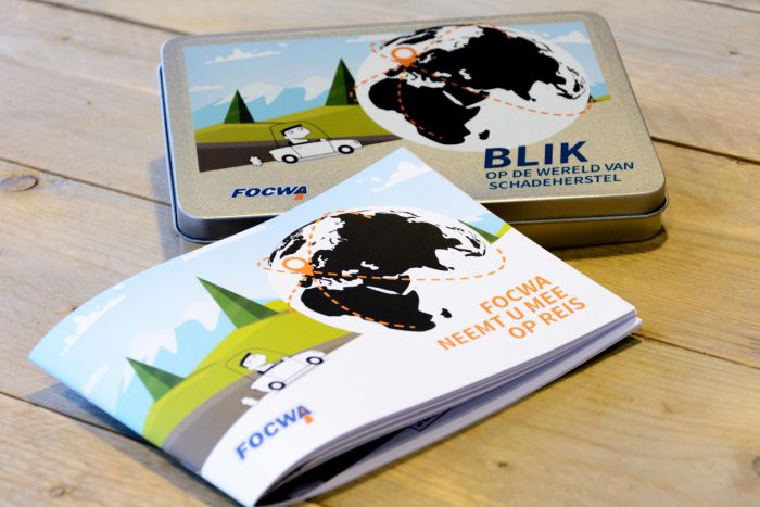 Aanvullend wilde FOCWA haar leden een speciale direct mailing versturen. Wij bedachten een blik. Auto, blik, een blik op de wereld van schadeherstel… Snap je ‘m? In het blikje vindt de ontvanger een reisgids, ook weer in het thema van de complete campagne, waarin we iets uitgebreider uitleggen wat FOCWA per ‘werelddeel’ allemaal doet.