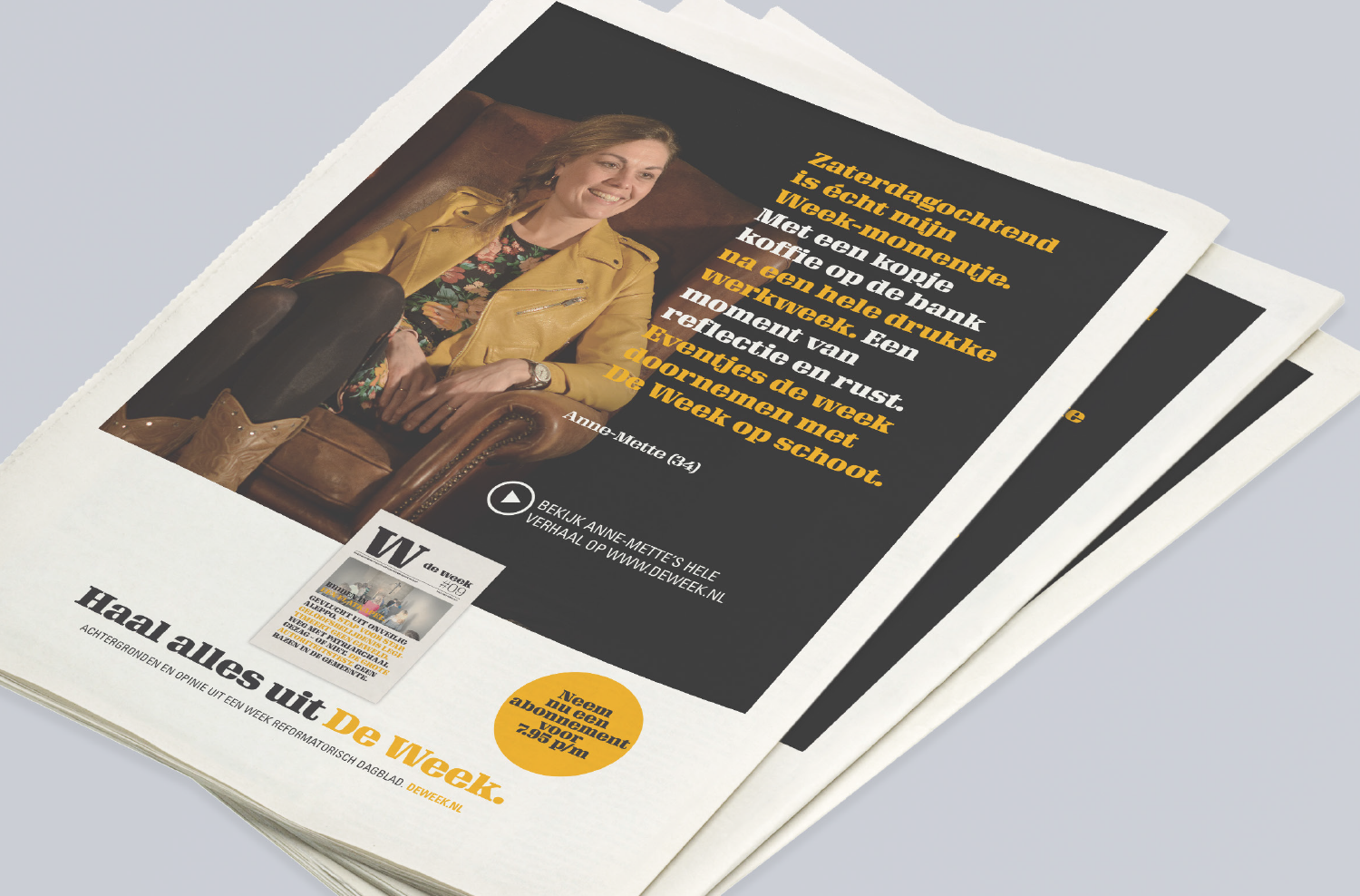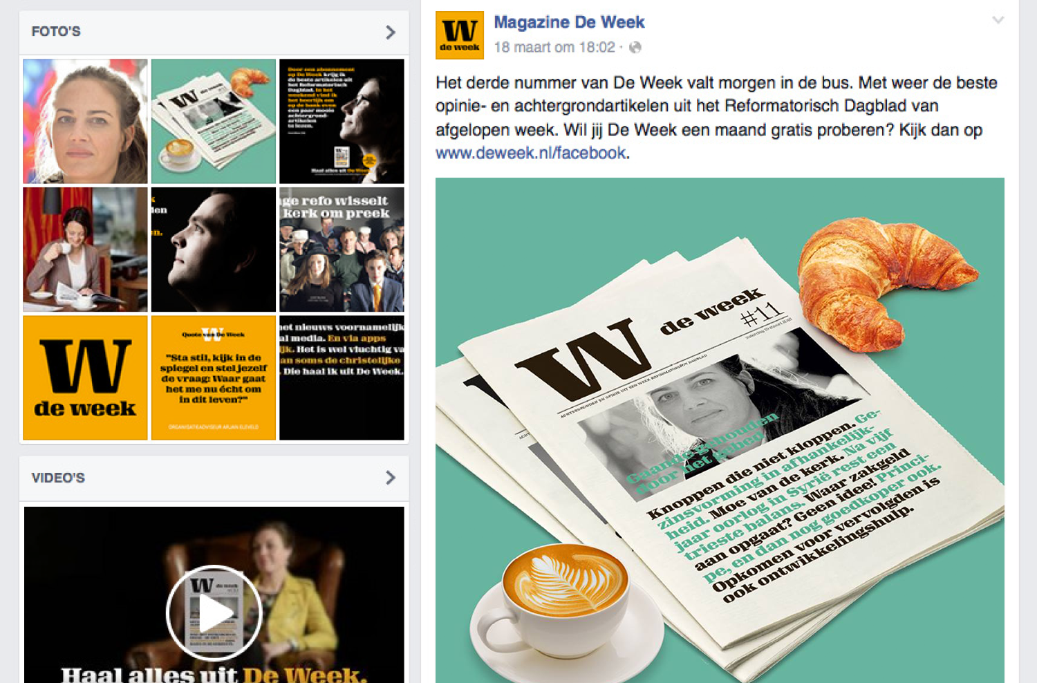Maak kennis met het gloednieuwe magazine De Week! Erdee Media Groep heeft De Week ontwikkeld op basis van uitvoerig onderzoek. Wat bleek: ‘jong volwassen’ christenen lezen weinig tot geen kranten meer. Zij maken gebruik van moderne media zoals Nu.nl, YouTube en social media. Handig, maar hierdoor missen zij wél de christelijke duiding. Deze vinden zij terug in De Week. Elke zaterdag valt dit magazine op de mat, met een selectie artikelen uit het Reformatorisch Dagblad van die week. Erdee Media Groep vroeg ons, om de introductiecampagne van dit fraaie magazine te bedenken, ontwikkelen en uit te voeren. Wij kozen voor een slimme mix van creatie (opvallend campagneconcept en mooie fotografie), contentmarketing (interviews, blogs, video’s en social) en online marketing (social advertising). Dit heeft al flink wat abonnees opgeleverd en we zijn pas net van start!