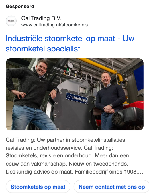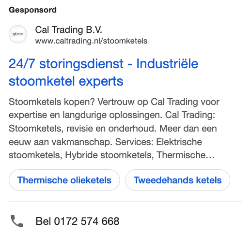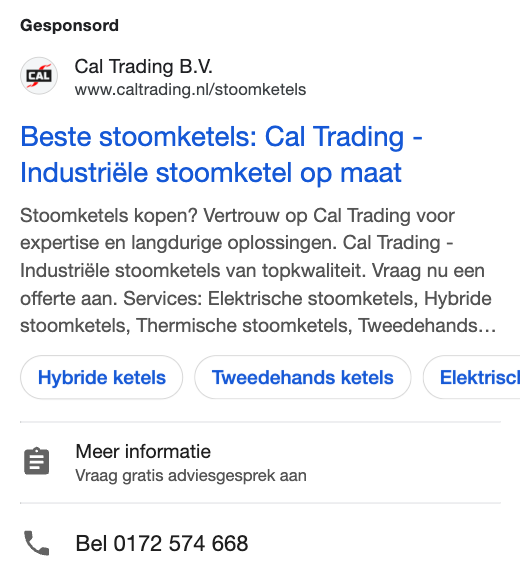 Dit zoekwoordenonderzoek konden we ook meteen gebruiken voor Google Search. We richtten het account van Cal Trading eenmalig in. Dat betekende dat we advertentieteksten schreven voor de acht zoekwoordgroepen die we in het zoekwoordenonderzoek hadden geadviseerd en dat we de campagne en de website zó inrichtten, dat alle resultaten goed konden worden doorgemeten. Denk aan klikken op e-mailadres en telefoonnummer, maar ook ingevulde contact- en sollicitatieformulieren.