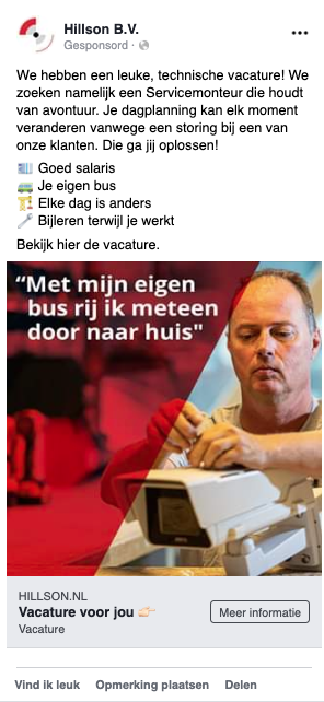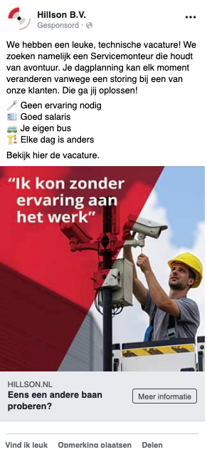 Via Facebook en Instagram kunnen we per vacature een hele specifieke doelgroep targeten. We stelden per vacature een eigen campagne in, waarbij we ons richtten op diverse doelgroepen. Zo richtten we ons voor de vacatures monteur zowel op een technische als een niet-technische doelgroep. De technische doelgroep heeft ervaring en is dus heel interessant voor Hillson. Maar ook als je geen ervaring in de techniek hebt, kun je bij Hillson aan de slag (leren in de praktijk). Voor bijvoorbeeld bouwvakkers en hoveniers is een baan als monteur interessant. Het werk is fysiek een stuk minder zwaar. Ook hen pakten we dus mee in deze campagne!