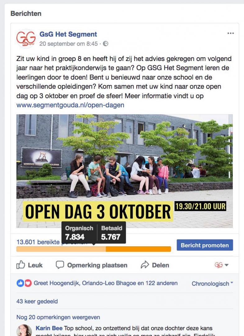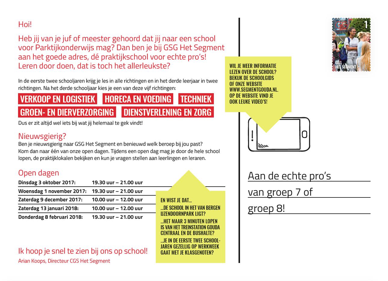Maar aan alleen een schoolgids heeft GSG Het Segment natuurlijk niet genoeg. De schoolgids moet ook verspreid worden onder de doelgroep. Daarom nodigden we ouders en leerlingen uit om langs te komen op de Open Dagen. Hiervoor maakten VRHL een poster, uitnodigingskaart en zetten we Facebookadvertising in.