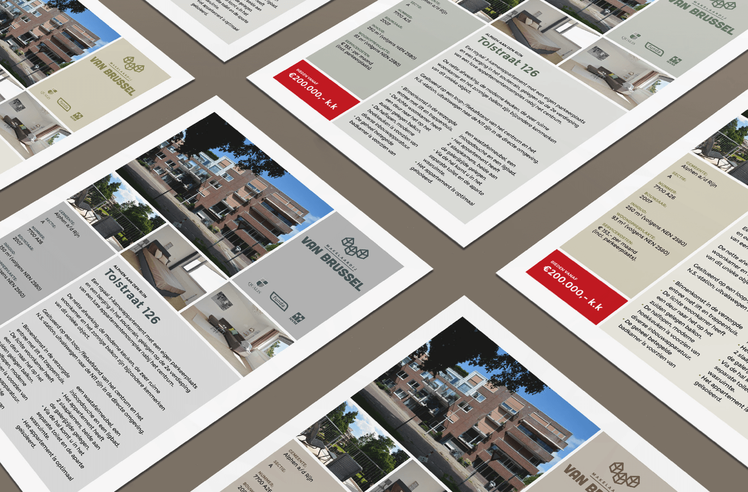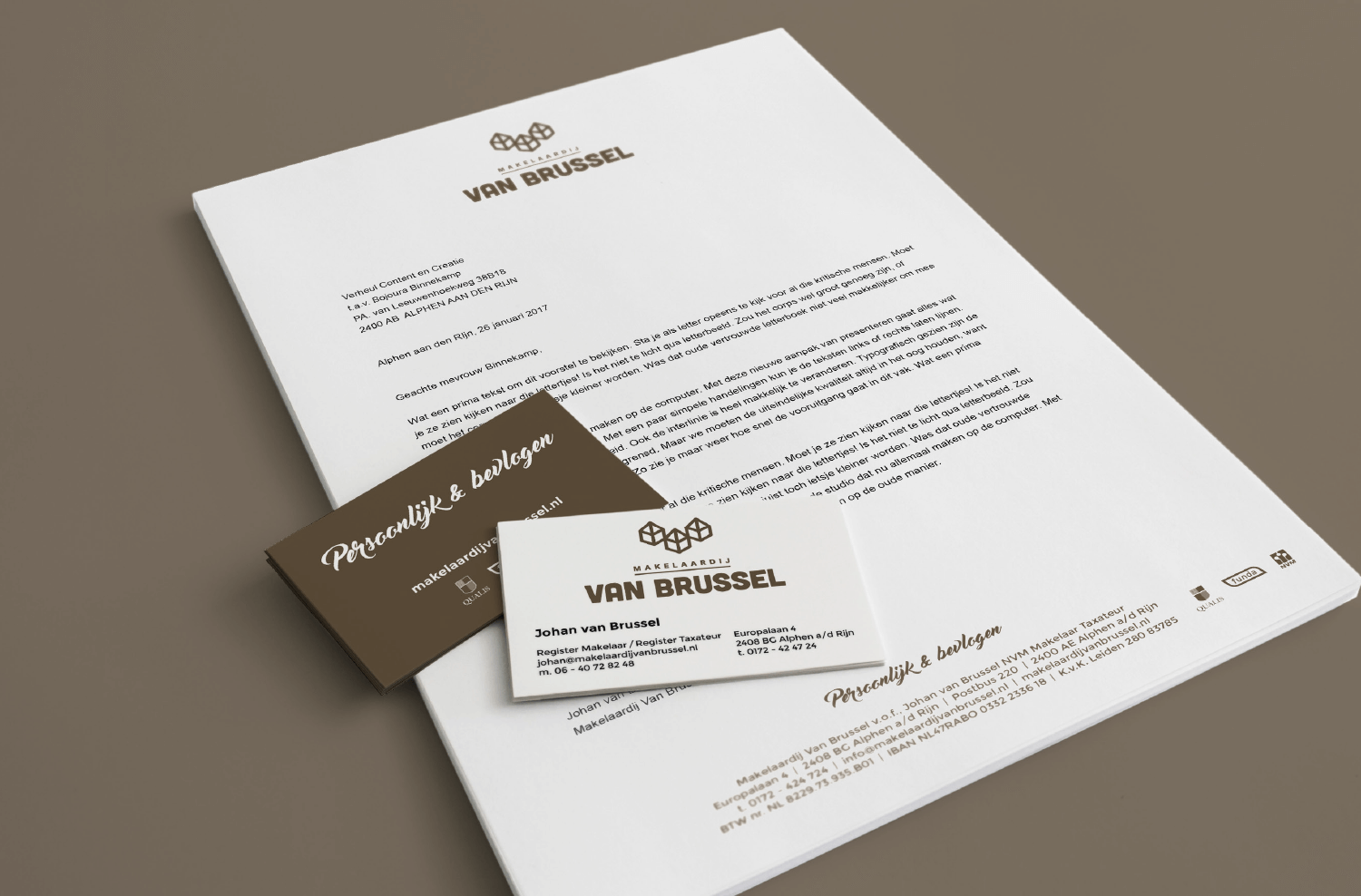 Van Brussel Makelaardij is een betrokken en bevlogen makelaarskantoor aan de Euromarkt in Alphen aan den Rijn. Het makelaarskantoor wilde een nieuw logo en dit overal doorvoeren: op de visitekaartjes, het briefpapier, de verkoopborden, de Facebookpagina en zelfs op hun bedrijfsauto’s. Een mooie opdracht voor onze art director!