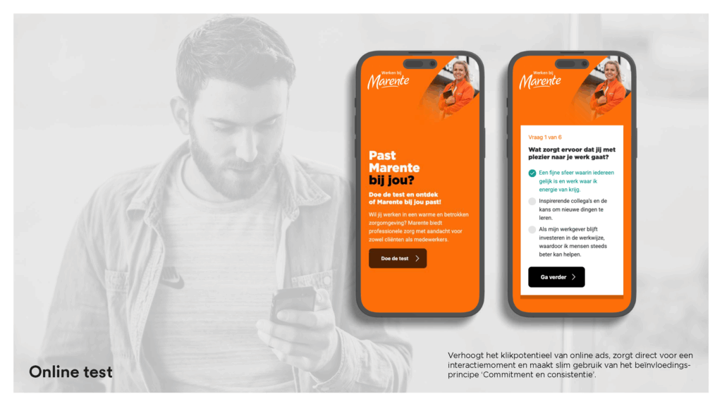 Met een paar vragen ontdekken kandidaten wat zij belangrijk vinden in werk. De uitslag koppelt ze direct aan passende verhalen en vacatures. Een toegankelijke eerste stap, die binnen social advertenties zorgt voor een duidelijke stijging in klikken. - Offline zichtbaarheid