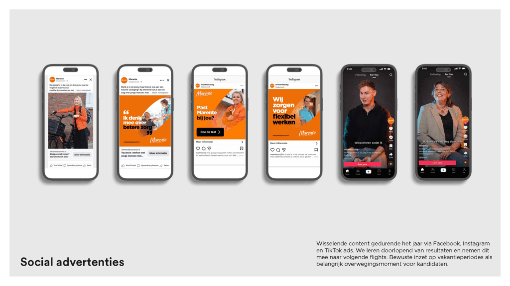 Marente heeft een sterk HR- en communicatieteam en een duidelijk werkgeversverhaal. En: er lag al behoorlijk wat content klaar. Ideaal, want zo konden we het grootste deel van het budget inzetten op bereik. Met een mix van online én offline kanalen houden we Marente het hele jaar door zichtbaar voor potentiële collega’s.